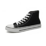 This classic black high-top canvas shoe features a simple and elegant design, making it a versatile choice for everyday wear. The upper is made of high-quality canvas material, offering breathability and durability for all-day comfort. The non-slip rubber sole enhances grip, ensuring walking safety. The timeless black-and-white color combination is stylish yet understated, suitable for various occasions, including campus life, casual outings, or daily commuting. The reinforced toe design improves durability, while the white laces add a touch of brightness to the overall look. This unisex shoe is an ideal choice for those seeking both comfort and style.