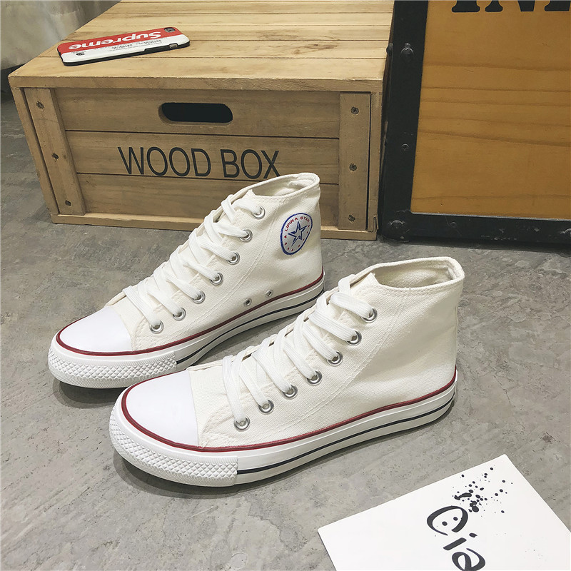 These classic white high-top canvas shoes feature a simple and retro design, making them a versatile and comfortable choice for daily wear. The upper is made of high-quality canvas material, which is breathable and durable for all-day comfort. The outsole is crafted from non-slip rubber, providing excellent grip and safety. The timeless white body with red and black accents adds a touch of style, making these shoes perfect for casual outings or everyday campus life. Designed to suit both men and women, they are a must-have addition to your wardrobe, ensuring confidence and comfort wherever you go.