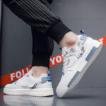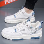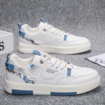 These trendy casual sneakers feature a classic white base accented with refreshing blue panels and geometric line details, delivering a modern and stylish design. Crafted with premium synthetic leather, the upper is soft, breathable, and easy to maintain. Paired with a durable, anti-slip rubber outsole, these shoes ensure confident strides and all-day comfort for any occasion.
