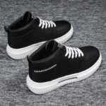 These black and white high-top sneakers combine fashion and functionality, making them the perfect fit for everyday wear and trendy street style. The upper is crafted from high-quality synthetic leather, presenting a sleek and premium texture. Paired with a durable white thick sole, these shoes provide excellent grip and support for all-day comfort. The classic lace-up design ensures a secure fit, while the unique brand print on the side adds a touch of style. Whether for casual outings, campus commutes, or trendy streetwear looks, these high-top sneakers are your ideal choice!