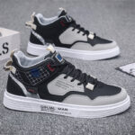 These trendy high-top sports casual sneakers feature a black and grey color scheme with modern lettering and geometric patterns, perfectly showcasing a sleek, urban style. The premium synthetic leather upper is durable, easy to clean, and designed for everyday wear. The soft, breathable lining and cushioned insoles ensure maximum comfort, even during extended walks or activities. The anti-slip rubber sole delivers excellent traction and durability, providing stability with every step. Branding and 3D detailing on the sides add a bold and fashionable touch, making these sneakers a must-have for trendsetters.