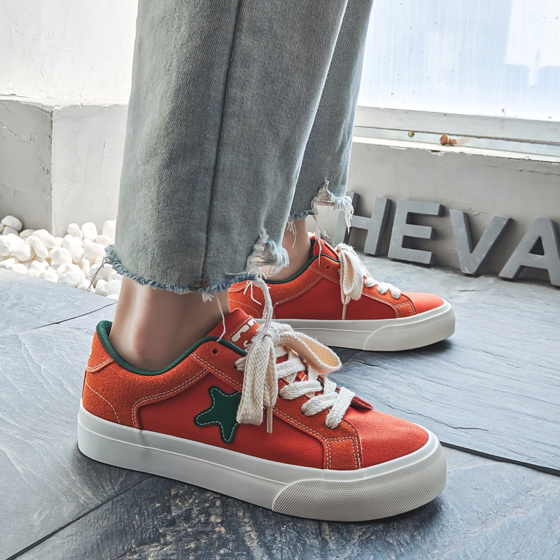 These low-top canvas shoes feature a bold orange upper paired with an eye-catching green star accent, showcasing a unique personality and youthful style. The clean silhouette combined with premium canvas material ensures a breathable and comfortable fit, perfect for daily outings or casual wear.